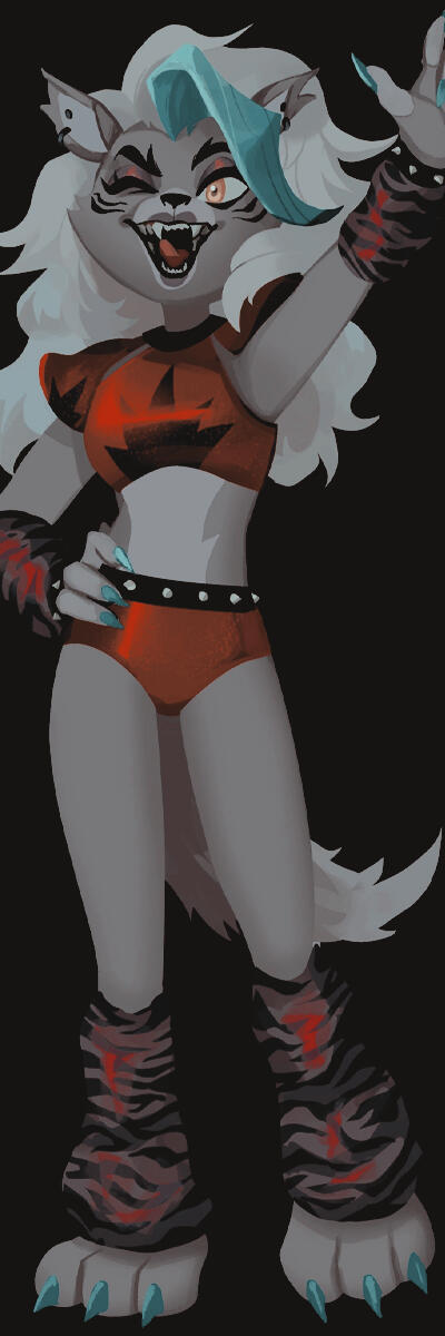 features :— purple freckles, long fox tail, red bow tie, sharp nails